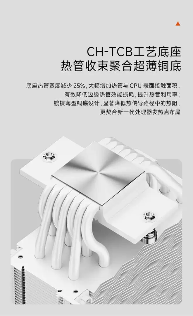 这款散热器的三维尺寸为122×111×159.5毫米,结构上采用了双风扇搭配厚单塔、七根热管以及镀镍薄铜底的组合。它的设计亮点在于热管底部:通过CH-TCB工艺,缩小了单根热管的宽度,从而让更多热管能够与处理器顶盖紧密接触。这可不是小改动,它直接提升了热管的利用效率,让热量传导更高效。散热器顶部则采用了CNC工艺打造的铝制磁性顶盖,质感与实用性兼备。风扇的安装方式也值得一提,采用了无扣条的卡扣设计,拆装起来非常方便。