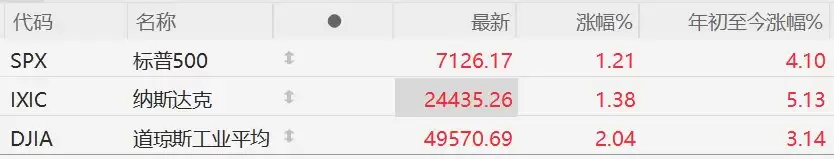 市场情绪持续升温,美国三大股指集体上扬。具体来看,道琼斯工业指数表现强劲,收盘上涨了2.00%。与此同时,标普500指数涨幅为1.2%,以科技股为主的纳斯达克综合指数也录得1.3%的涨幅。