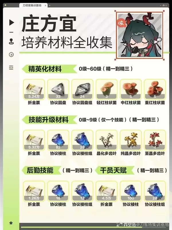 随着《明日方舟:终末地》1.2版本更新,限定UP角色庄方宜的加入,让许多博士开始关注其完整的培养成本。为了帮助大家高效规划开荒资源,避免不必要的浪费,本文将详细汇总庄方宜从零培养至完全体所需的全部材料清单,助你提前备战,实现资源最优配置。