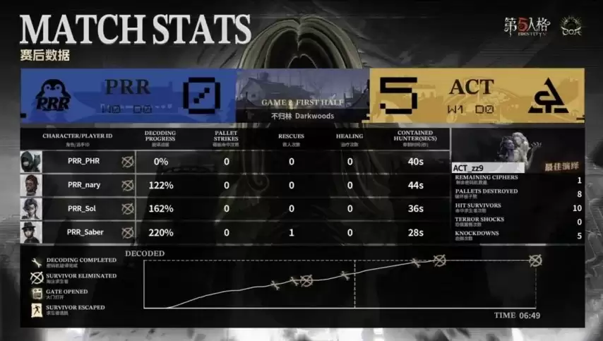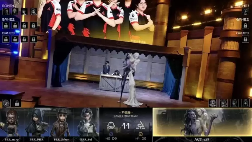 双方攻防互换,PRR求生者选出医生、幸运儿、古董商与守墓人的阵容;ACT监管者zz9同样以时空之影应对,并禁用了大副、咒术师、幻灯师与魔术师。