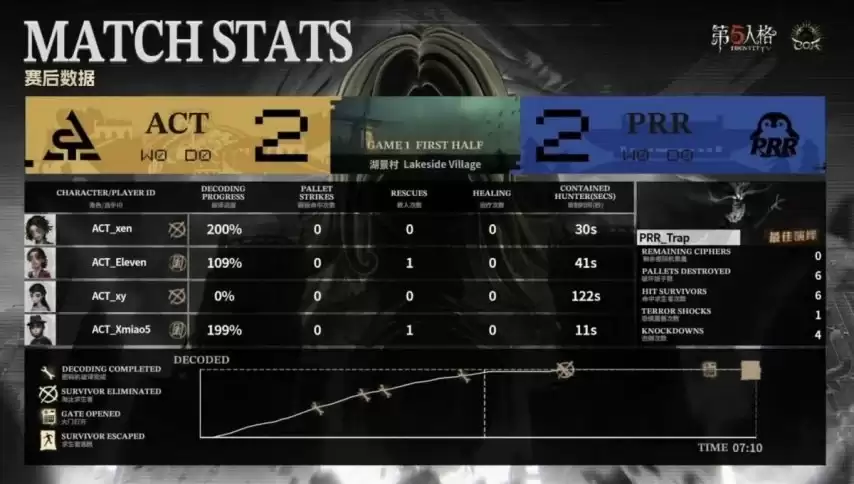 比赛开始,双方在BP阶段便展开心理博弈。ACT求生者方选出了魔术师、古董商、木偶师与大副的牵制救援体系;PRR战队的监管者Trap则拿出时空之影,并针对性禁用了医生、幻灯师、咒术师与飞行家四位角色。