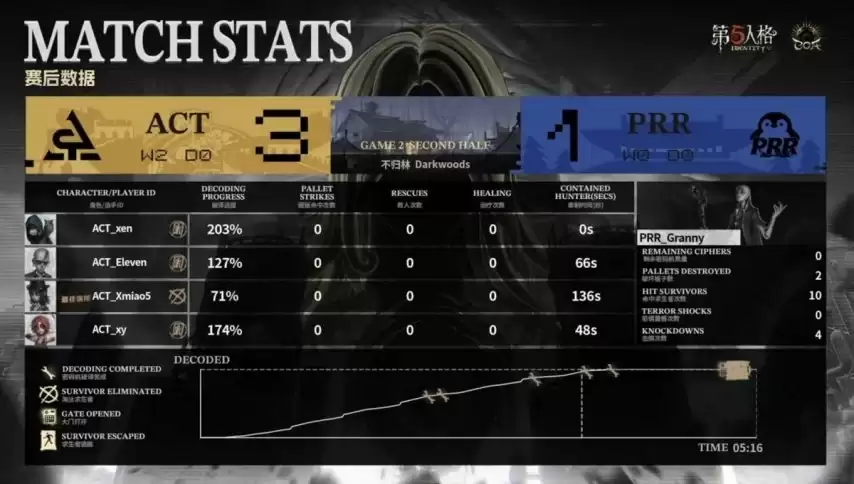 最终逃生阶段,隐士虽淘汰了幻灯师,但ACT其余三名队员全部成功逃脱,完成三跑。最终,ACT在第二局下半轮以3:1的比分锁定胜局。
