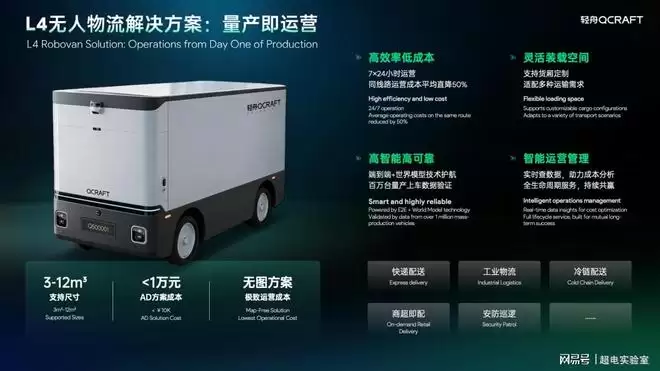 具体来看成果:轻舟L4级无人物流车的单车自动驾驶解决方案成本已控制在1万元以下,在同一条线路上,其平均运营成本相比人工配送可降低超过50%,并且支持全天候不间断运营。安全性方面,得益于百万台NOA(导航辅助驾驶)量产车所沉淀的海量数据反哺L4模型训练,其AI系统在应对拥挤街巷、混合交通流以及各类“长尾”极端场景时,都展现出了经过规模化验证的安全可靠性。此外,该方案覆盖从3到12立方米不等的多种装载空间,能够灵活适配快递配送、冷链物流、商超即时配送、工业物流乃至安防巡逻等多种场景需求。