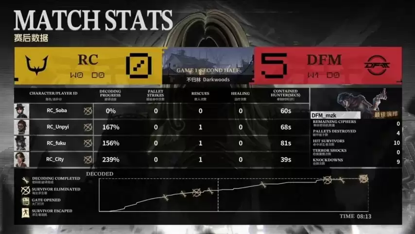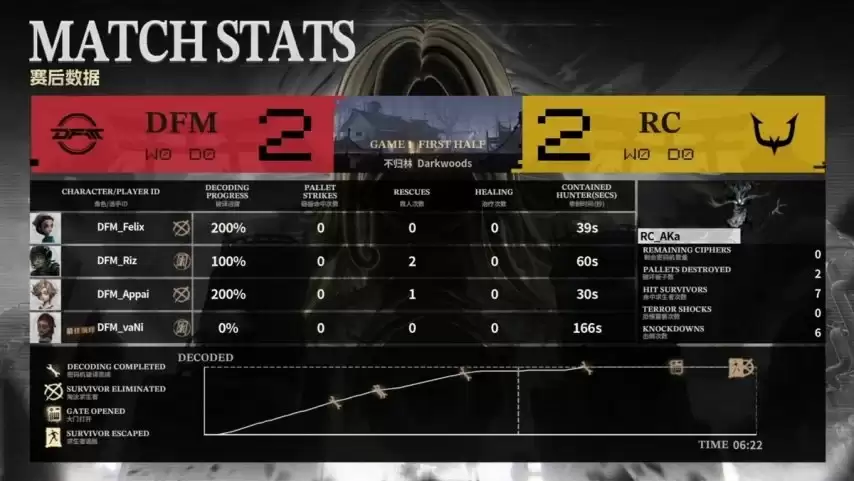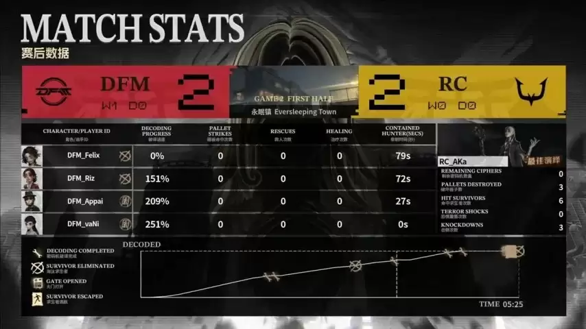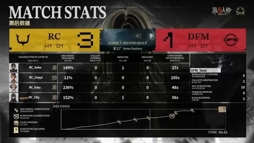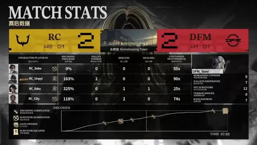 最终对决,RC求生者阵容为邮差、冒险家、气象学家和佣兵(禁用了“跛脚羊”和“台球手”);DFM监管者Yami再次选出时空之影。(禁用了先知、古董商、“逃脱大师”和勘探员)