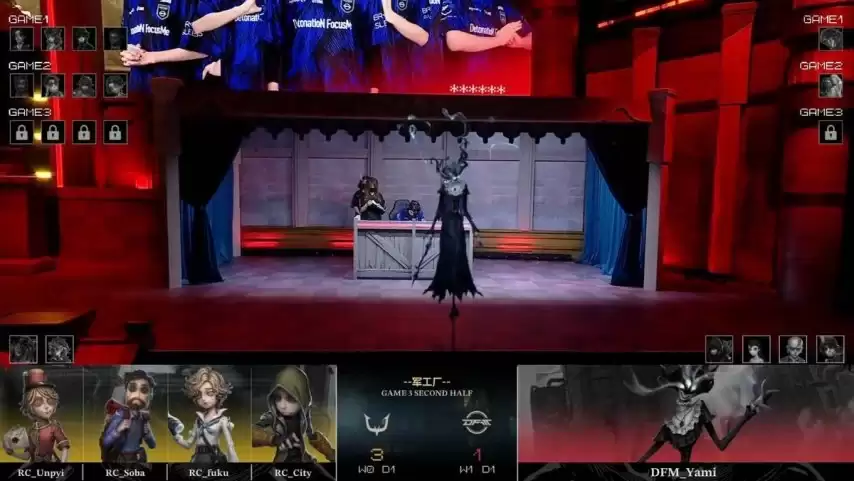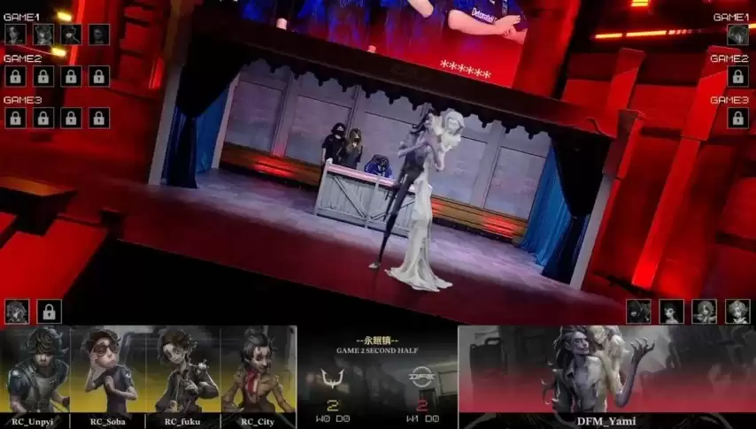 RC求生者拿出了飞行家、幸运儿、木偶师和野人的阵容(禁用了“台球手”);DFM监管者Yami则选出蜡像师进行克制。(禁用了先知、古董商、弓箭手和气象学家)