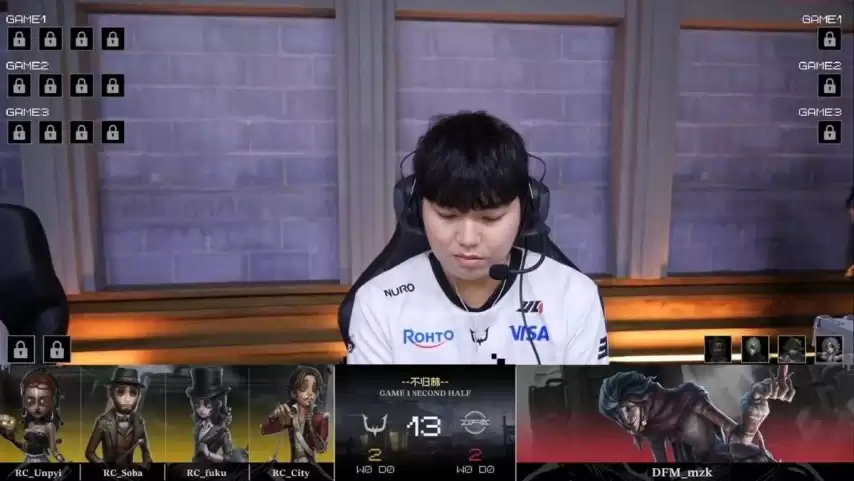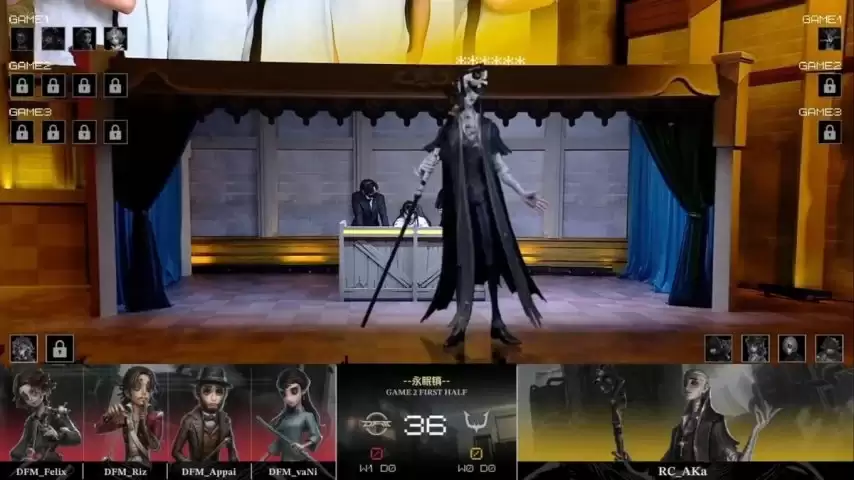 第二局,DFM求生者阵容调整为木偶师、大副、魔术师和古董商(禁用了“台球手”);RC监管者AKa则选出隐士进行应对。(禁用了先知、幻灯师、守墓人和飞行家)