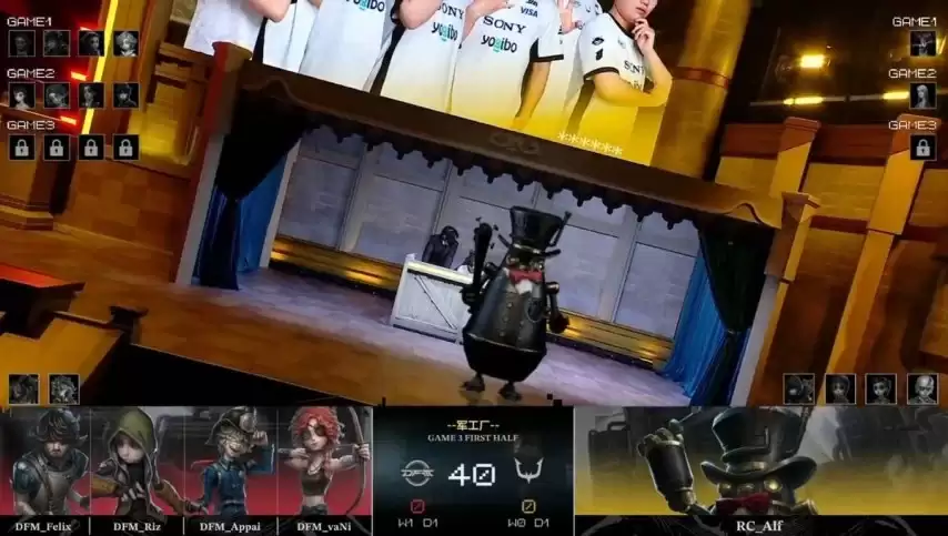 决胜局上半轮,DFM求生者派出飞行家、佣兵、火灾调查员和弓箭手的阵容(禁用了“跛脚羊”和“台球手”);RC监管者Alf则拿出了控场能力极强的邦邦。(禁用了先知、机械师、空军和“逃脱大师”)
