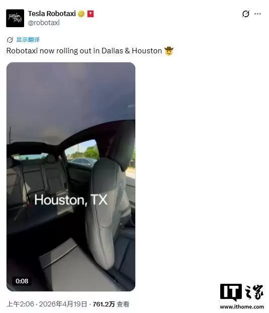 官方的发布相当简洁,只有一句话:“Robotaxi现已在达拉斯和休斯顿推出”。不过,随文附上的一段14秒视频,却传递了更关键的信息:画面中,特斯拉车辆在完全无人监控、驾驶座空空如也的状态下自主行驶。这无声的画面,比任何文字都更有说服力。