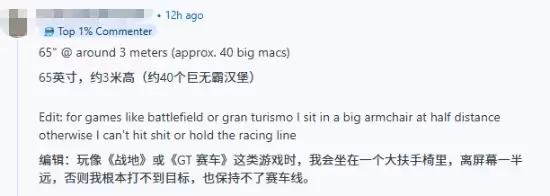 更有趣的是,评论区还出现了一批“灵活战术派”。他们分享的秘诀是“因游戏而异,动态调整距离”:在游玩《战地》等竞技射击游戏,或《GT赛车》这类拟真驾驶游戏时,会刻意将座椅向前挪近一半。原因很实际——距离太远会影响瞄准精度和赛道视线判断,导致“看不清敌人、控不住行车线”。这种针对不同游戏类型优化观看距离的做法,堪称将游戏体验研究到了极致。