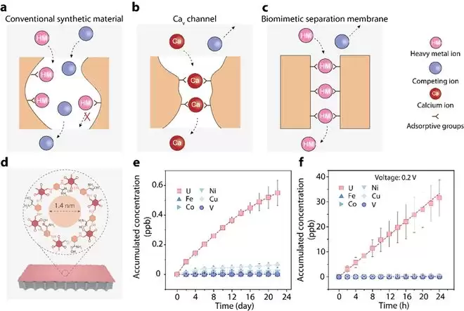 为验证这一仿生分离理念,团队选用结构可精准设计的共价有机框架材料作为制备基底。研究人员精心筛选了孔径略大于目标离子的COF膜,并在其纳米孔道内壁高密度接枝了对铀酰离子具有特异性强吸附作用的偕胺肟功能基团。实验结果显示,即使在真实海水这种含有大量钠、镁、钙等竞争离子的复杂体系中,该仿生膜仍能持续、高效地选择性富集铀,展现出优异的抗干扰能力和分离稳定性。