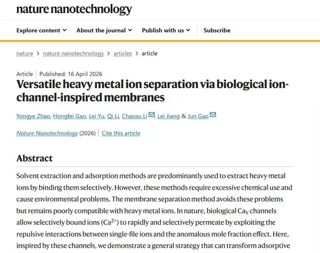 4月17日,中国科学院青岛生物能源与过程研究所联合江汉大学、中国科学院理化技术研究所,共同宣布在战略性金属资源回收领域取得重要进展。研究团队成功开发出一种具有普适性的关键金属离子膜分离新技术。该技术方案能够绿色、高效且高选择性地从复杂溶液环境中提取铀、铜、金等稀缺金属资源,精准解决了传统提取工艺普遍存在的高污染、高能耗与低效率难题。这项突破性研究成果已于4月16日在线发表于国际权威期刊《自然·纳米技术》。