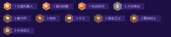激活的羁绊效果是阵容战斗力的根本,这套体系能触发:1 汪星机器人、1 暮光铁壁、1 命运祭司、5 太空律动、2 魔术师、2 游侠、2 斗士、2 堡垒卫士、2 重装战士、2 未来战士。羁绊组合非常全面,同时兼顾了前排承伤、后排输出以及功能性辅助。