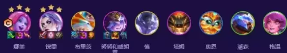 该阵容的完全体通常由以下英雄构成:娜美、锐雯、布里茨(机器人)、努努、慎、塔姆、奥恩、潘森、格温。