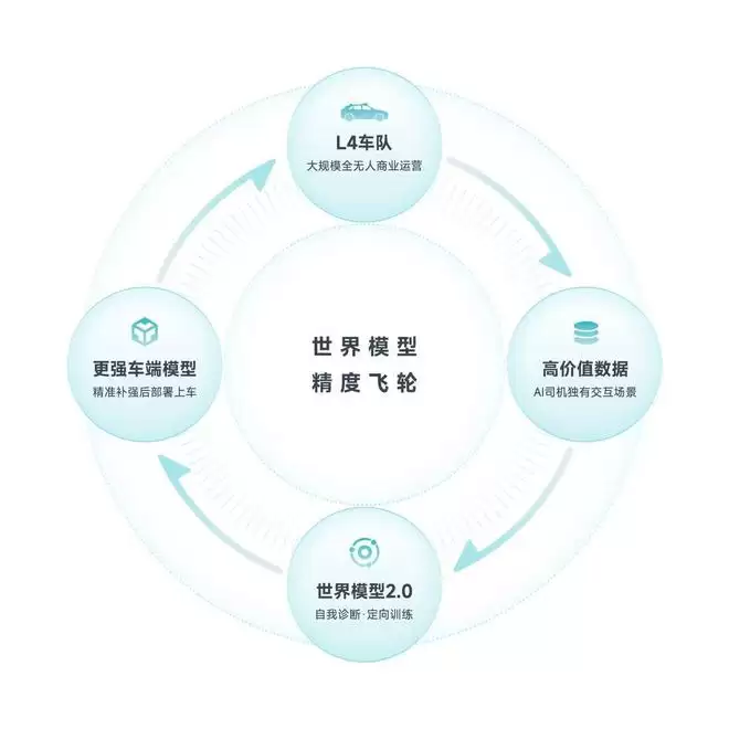 这一系列变革,共同构建了一个强大的“精度飞轮”:大规模L4无人车队上路运营,源源不断地产生真实世界的高价值数据(尤其是AI与其他交通参与者之间那些独特的交互数据)→ 这些数据驱动世界模型精度提升 → 进而增强车端模型的实际驾驶能力 → 更强的能力支撑更大规模的车辆部署 → 产生更多高价值数据。如此循环,生生不息。