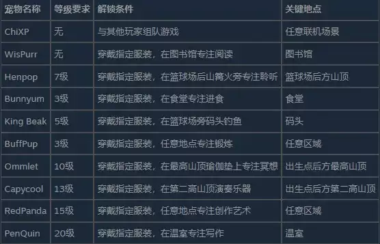 所有宠物成就的解锁,都严格遵循一个“三位一体”的核心规则:穿戴特定服装 + 身处指定地点 + 保持专注状态持续15分钟。这三个条件必须同时满足,缺一不可。此外,部分稀有或高级宠物还会对玩家的账号等级提出要求,这为资深玩家增添了一份额外的挑战与荣誉感。