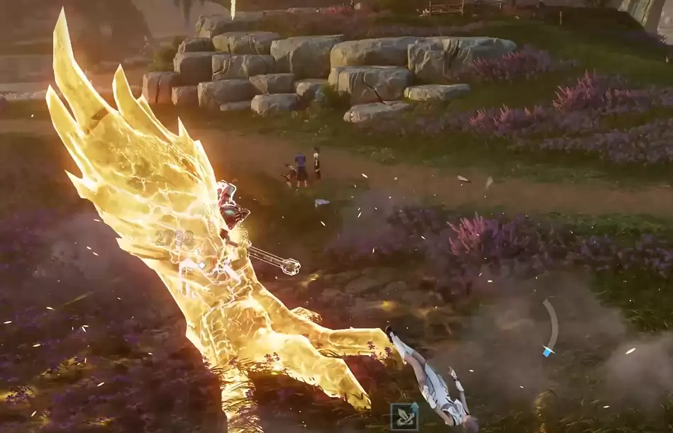 生存是输出的基础,精准躲避技能至关重要。铸龙骑士会施放一个范围极大的“龙卷风”技能,此技能极具威胁:它会持续将玩家角色向后方吹飞,打乱输出节奏与站位,并在最终于场地边缘生成一圈黄色的持续范围伤害区域。一旦被吹飞,很难调整走位规避后续黄圈。应对此技能有两种策略:一是提前预判,在技能发动前移动至场地中央的安全区域;二是若躲避不及,可果断切换后备角色,利用其血量承受伤害,以保全主力输出角色的状态。