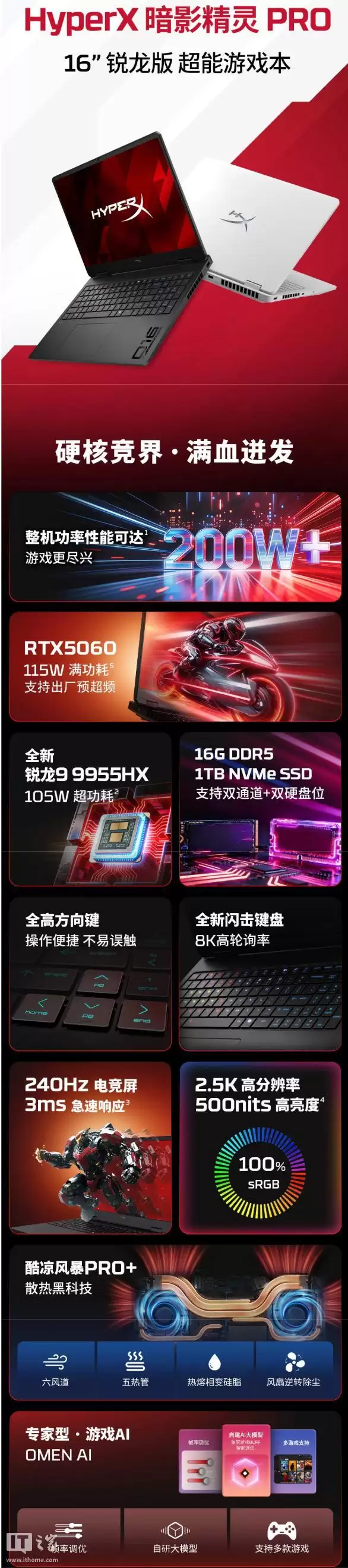 其核心搭载了16核心32线程的锐龙9 9955HX处理器,匹配RTX 5060显卡。散热方案与英特尔16英寸版看齐,采用双风扇6风道设计,电池也是70Wh。这为青睐AMD平台的玩家提供了一个性能强劲的新选择。