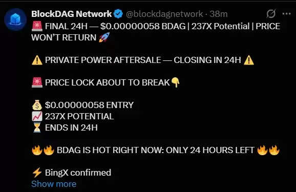 备受瞩目的Web3项目BlockDAG,其代币BDAG的上市日期终于尘埃落定。根据项目官方在X平台发布的最新公告,BDAG交易将于4月21日在全球知名交易所BingX正式启动,并随后于4月24日登陆另一主流平台Gate.io。这一关键信息的发布,正值其预售阶段进入最后24小时倒计时,瞬间点燃了社区与早期投资者的热情。