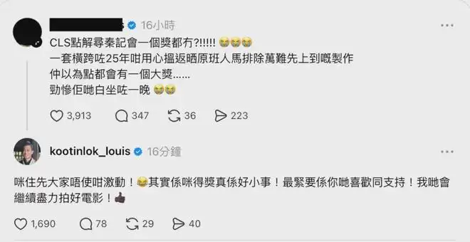 古天乐叫粉丝无需激动,表示:“其实是不是得奖真的是小事!最重要的是你们喜欢和支持!我们会继续尽力拍好电影!”(Threads)