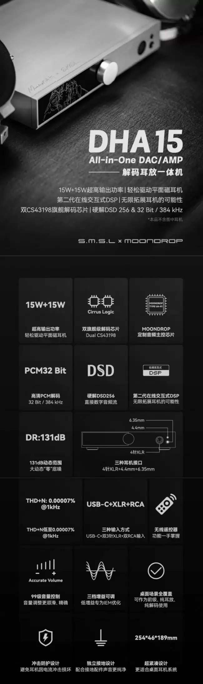 水月雨联合双木三林推出 DHA15 解码耳放一体机:提供 15W+15W 推力、双 CS43198 解码芯片 2999 元