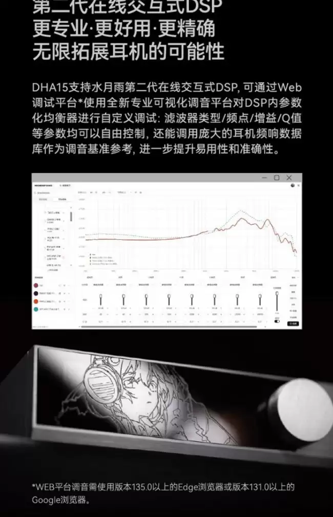 除了硬件堆料,软件可玩性也没落下。这台机器接入了水月雨第二代在线交互式DSP平台,支持可视化调音曲线自定义。用户可以根据自己耳机的特性,或者纯粹依据个人听音偏好,对频响进行精细化的调整。这相当于把一部分“调音权”交给了用户自己。