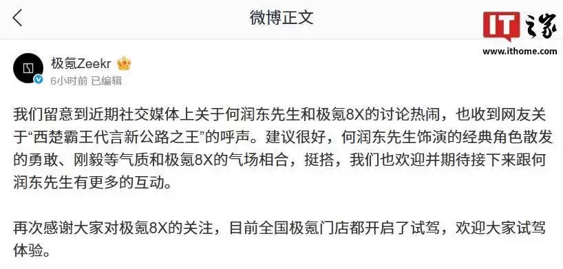 极氪回应网友建议:何润东“西楚霸王”气质与极氪8X气场相合,期待互动