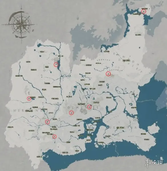 除了自建工坊,游戏世界中还存在多处固定染色点。下方地图清晰标注了所有可用的染坊位置,方便你随时进行色彩改造。