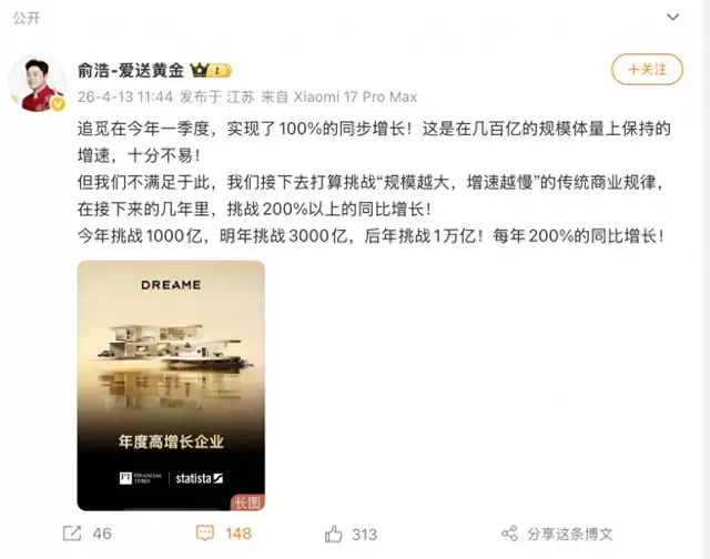 他的梦想,从来都与“小富即安”无关。他曾公开表示,希望将追觅打造乘人类有史以来最伟大的企业之一,成为一家价值百万亿的公司,超越苹果、特斯拉、谷歌等所有历史上的商业巨头。2026年4月,他带着一季度翻倍增长的业绩回归,明确提出今年挑战千亿营收、后年瞄准万亿的目标,甚至意图挑战“规模越大,增速越慢”的商业铁律,追求持续的超高速增长。