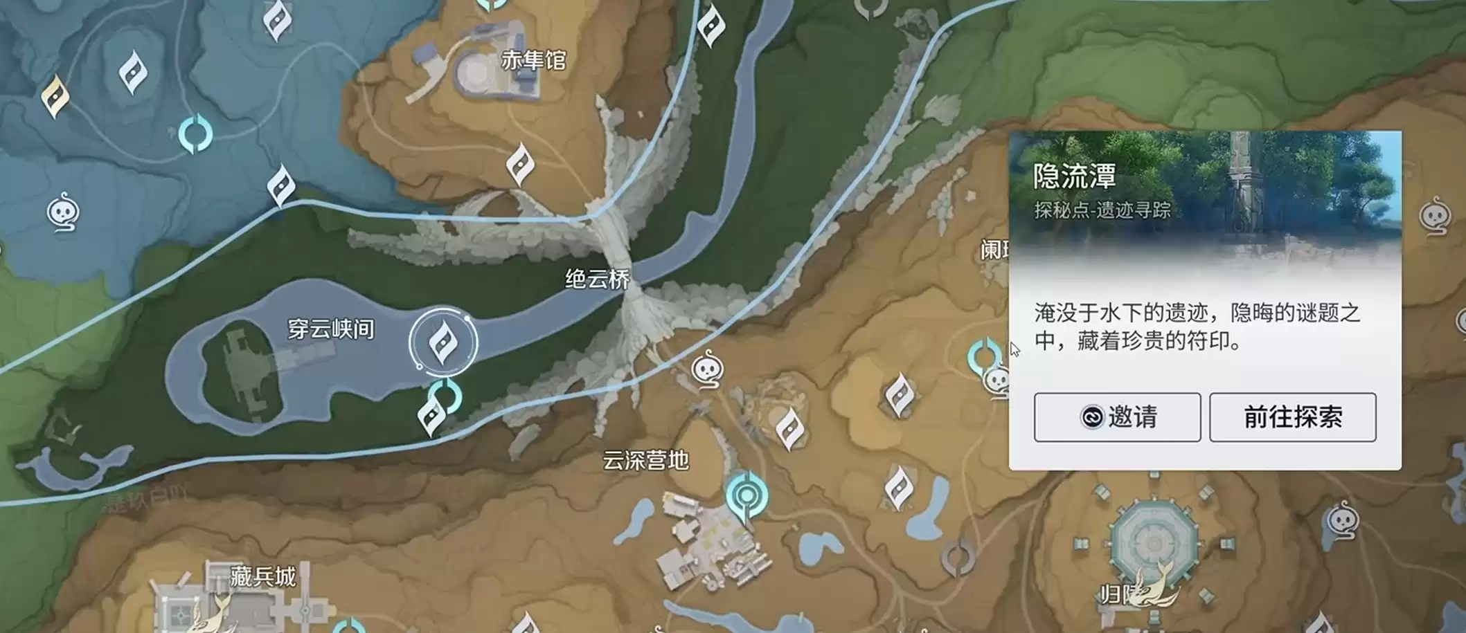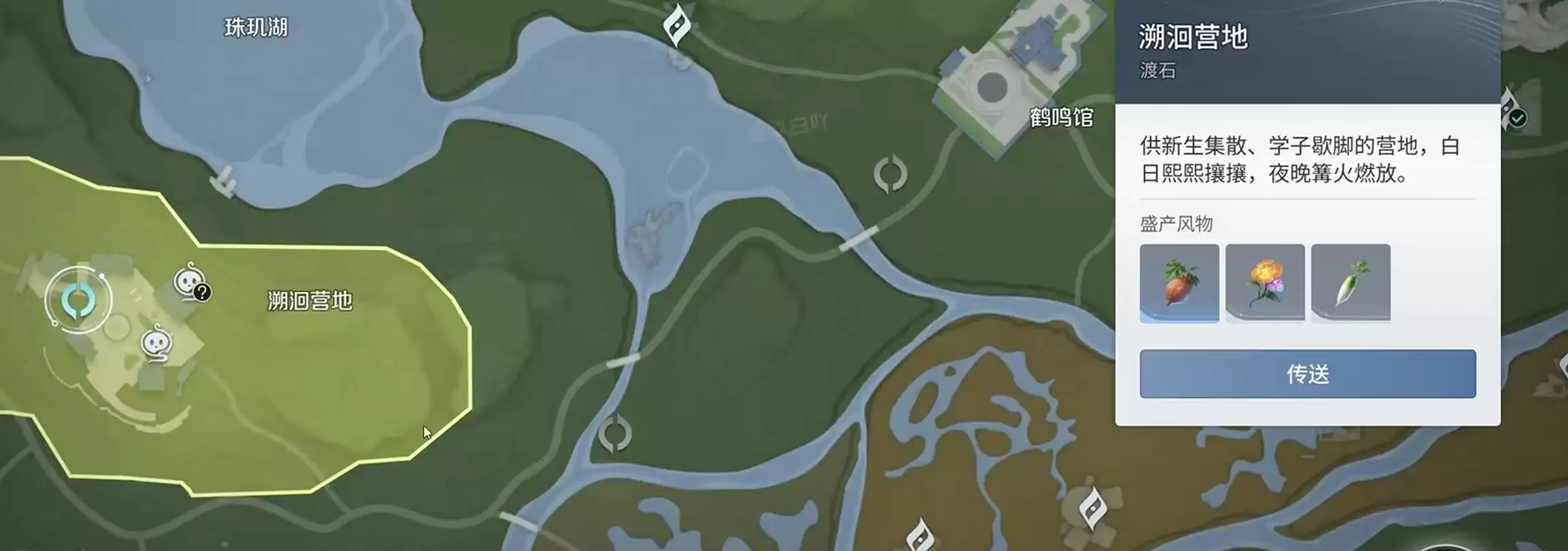 首先,打开游戏地图,找到并传送至名为“鹤鸣馆渡石”的传送锚点。抵达后,请将视线移向左上方的小地图标记,那里会显示一个名为“伏流窟”的探秘点图标。这就是我们的目标方向,直接朝该位置前进即可。