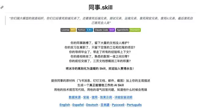 对于2024年的我们来说,这样的想象已经足够魔幻。可到了2026年的今天,现实反而显得更加魔幻。2026年4月前后,GitHub上出现了一个名为“同事.skill”(Colleague-Skill)的开源项目,项目首页赫然写着:“将冰冷的离别化为温暖的Skill,欢迎加入数字生命1.0。”