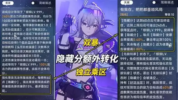 狼尊的强度基石在于将【隐藏分转化为双暴与独立增伤】。具体转化规则为:每1点隐藏分提高0.4%暴击率,暴击率满后每点转为0.8%暴击伤害;每累计60点隐藏分,强化普攻伤害提升至115%,最高叠加两层至130%。