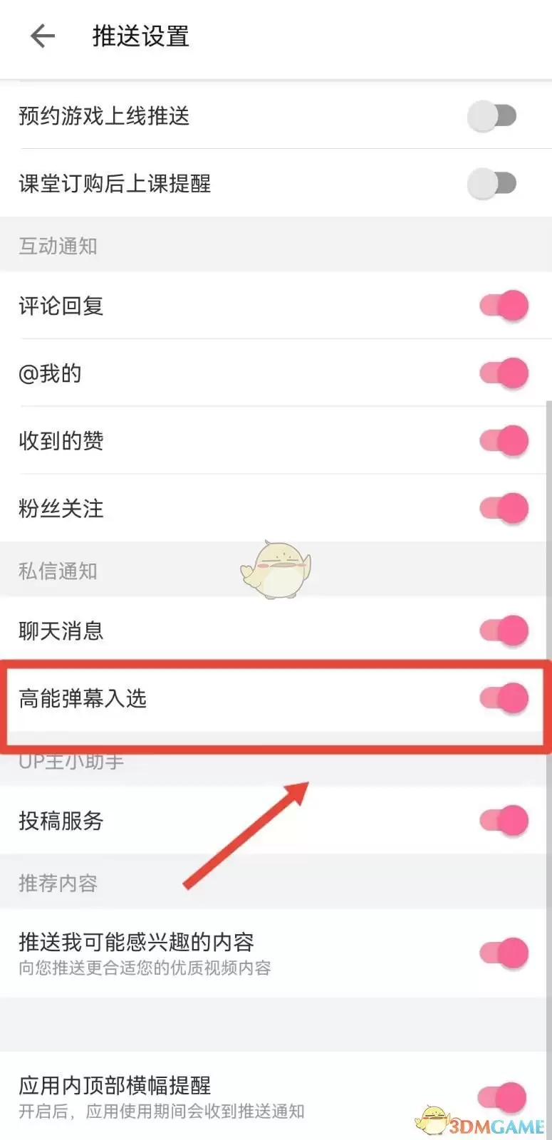 4. 在通知细分菜单中,找到【弹幕相关通知】或【互动消息】,开启“高能弹幕入选提醒”的开关。