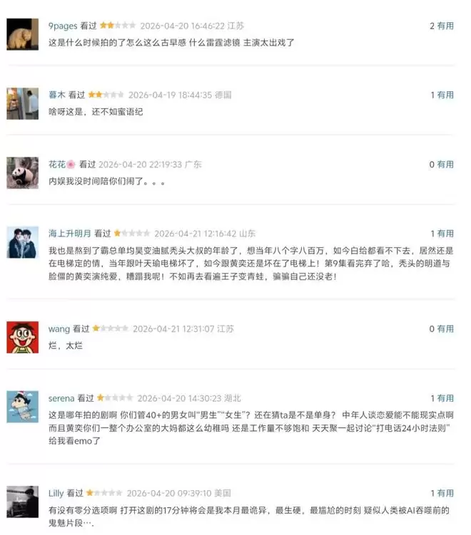 有观众尖锐指出,观看该剧的前十几分钟,体验堪称“尴尬”与“生硬”。若考虑到该剧为五年前拍摄的库存作品,其呈现出的“悬浮感”与“时代隔阂”便不难理解——那正是当时部分国产剧脱离现实的通病。
