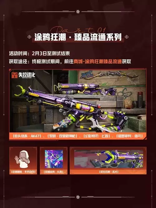 公测专属皮肤:比如“AK47-涂鸦狂潮”橙色皮肤,公测版本会重新开放获取路径。