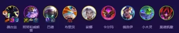 阵容的完全体需要以下九名英雄:薇古丝、努努、巴德、布里茨(机器人)、娑娜、卡尔玛、俄洛伊、小木灵、莫德凯撒(铁男)。