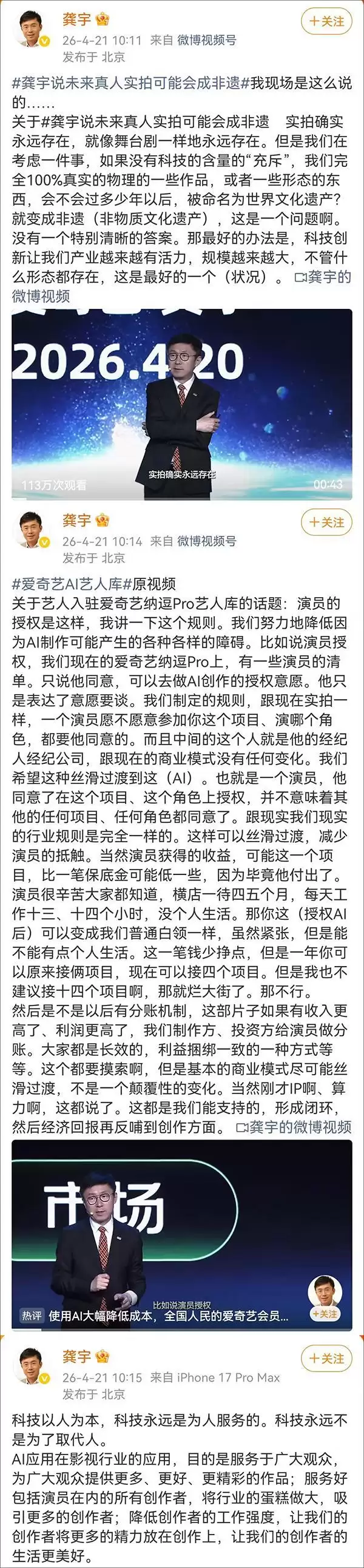 4月21日,“爱奇艺CEO龚宇发声”话题登上各大平台热搜榜。事件的起因,是爱奇艺创始人兼CEO龚宇在个人社交账号连续发布三条动态。他不仅分享了前一日在“2026爱奇艺世界·大会”上的演讲视频,更深入阐释了一个核心理念:科技发展的本质应坚持以人为本,其终极使命是更好地服务人类、赋能人类,而非替代人类。