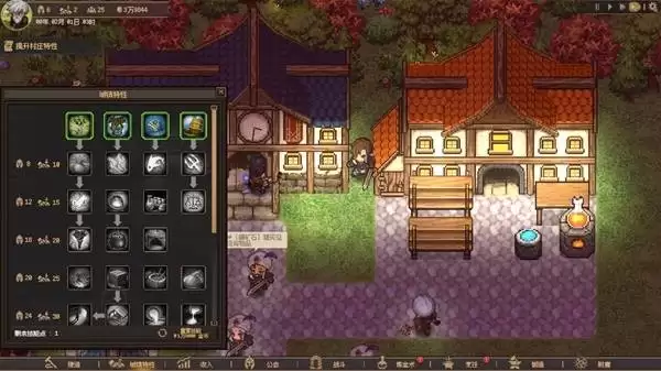 成功通关地下城不仅能获得资源,还会奖励宝贵的技能点。打开城镇特性面板,这里有一整条技能树,使用技能点可以永久提升你的村庄各项能力,如生产效率、战斗加成等。