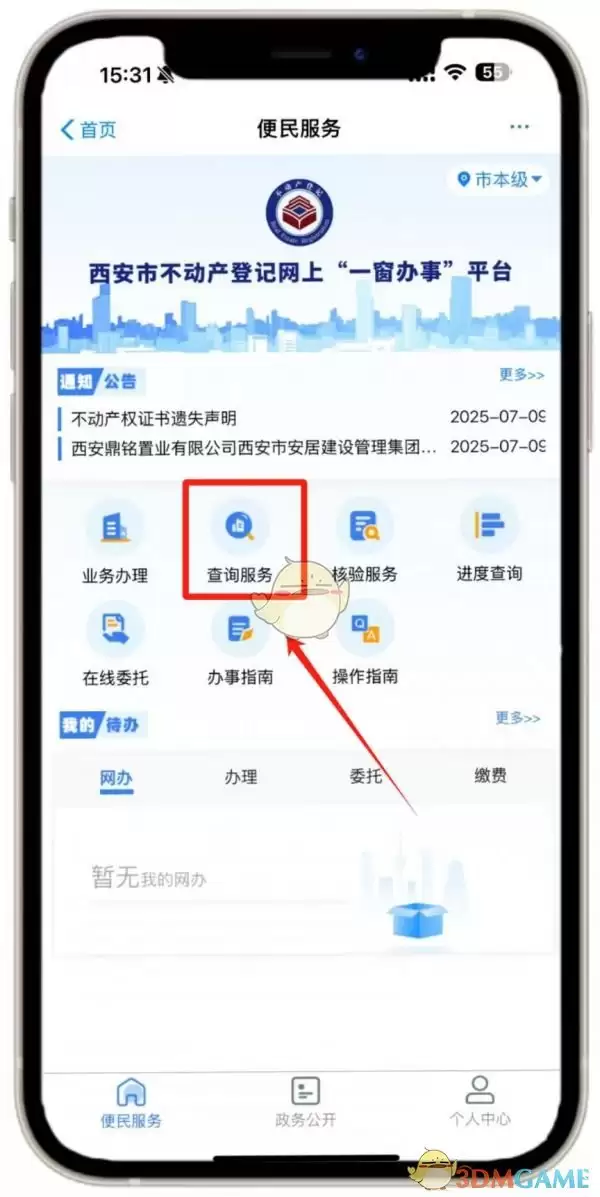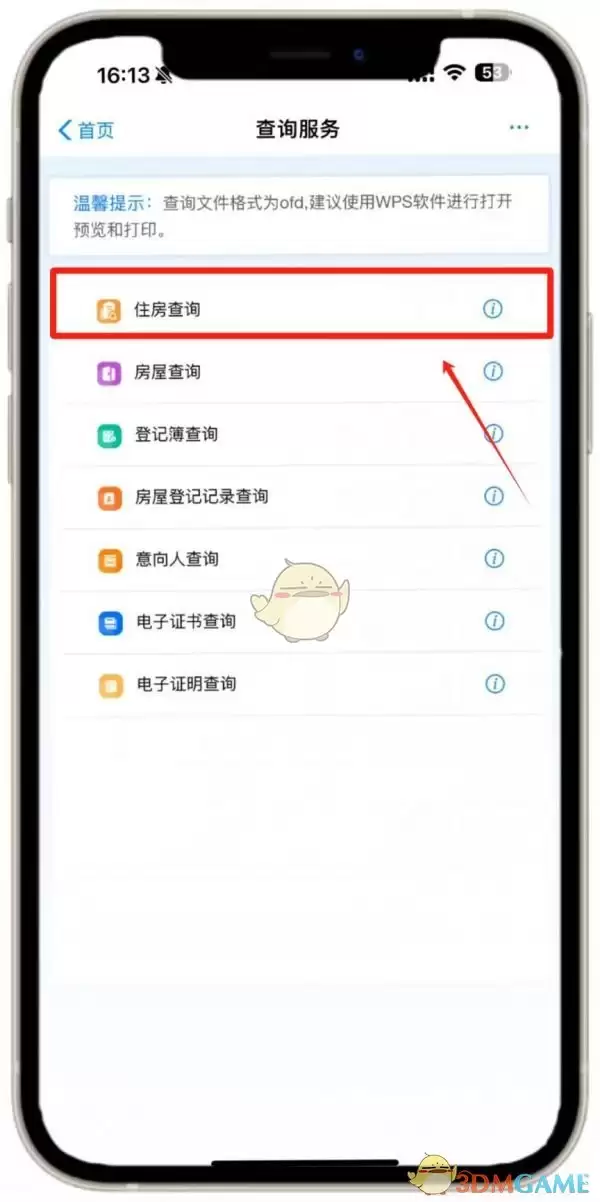 在不动产服务页面内,您会看到“信息查询”、“证明开具”等各类服务。请点击【查询服务】或类似选项,然后在列出的具体事项中,准确选择【住房查询】(也可能显示为“个人住房情况查询”)。