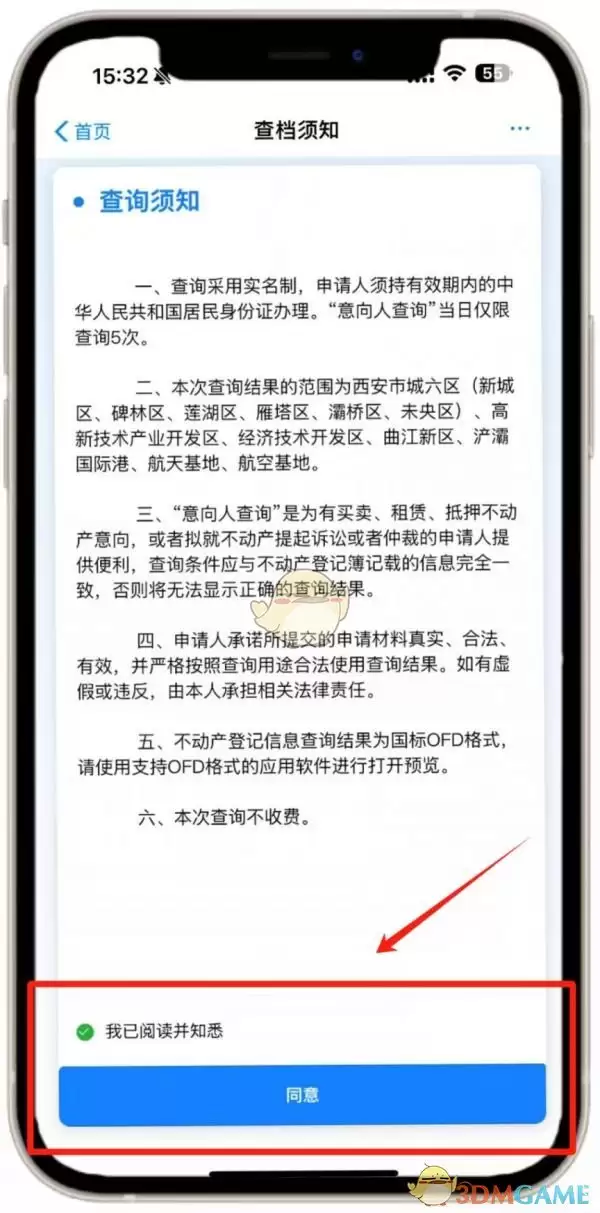 接下来,系统会显示《查询须知》或用户协议,详细说明了查询权限、用途及法律责任。请务必仔细阅读,然后勾选“我已阅读并同意”前方的方框,并点击【同意】或【下一步】按钮。