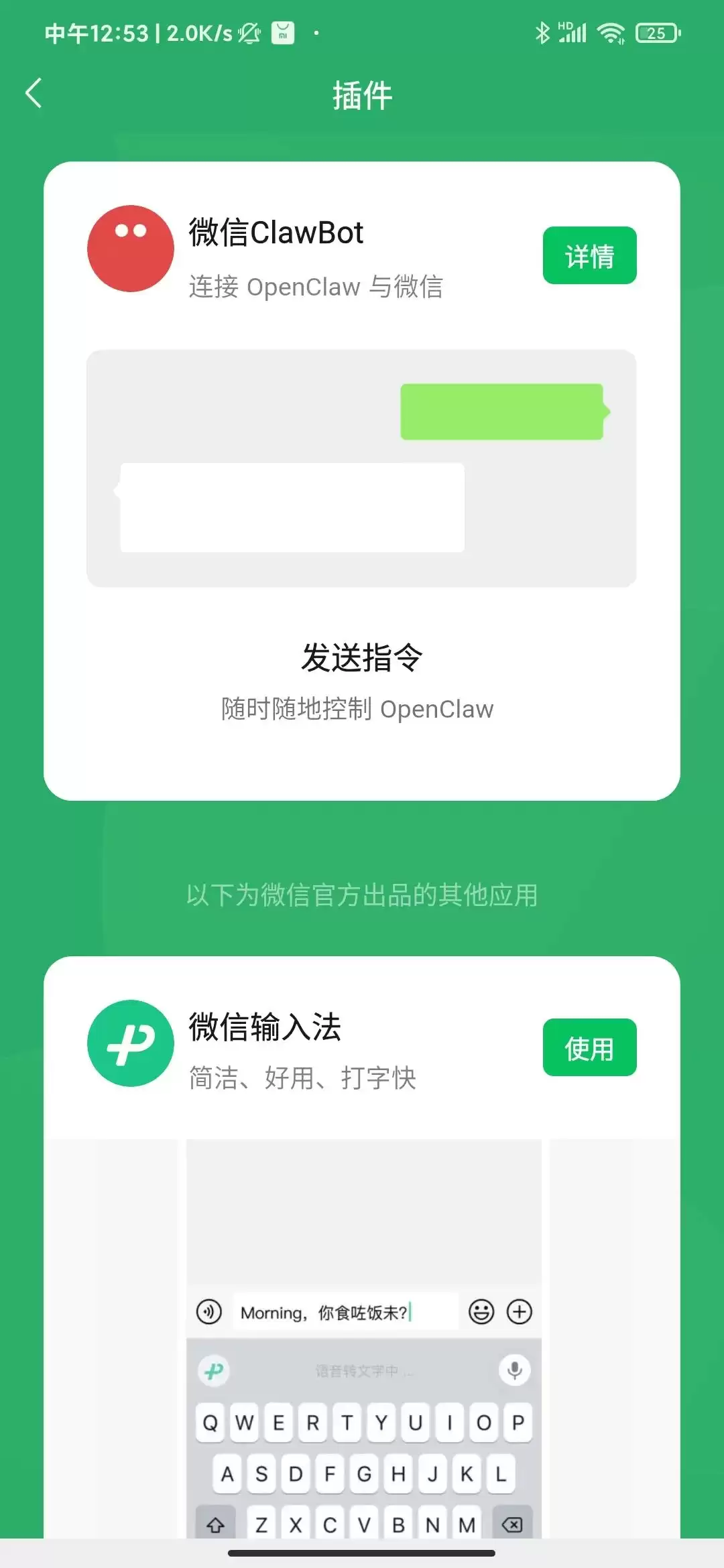 我的微信版本是8.0.69,操作路径并不复杂:点击「我」→「设置」→「插件」,在里面找找看有没有「微信ClawBot」。如果没看到也别急,它还在灰度测试阶段,多刷新几次或许就出来了。