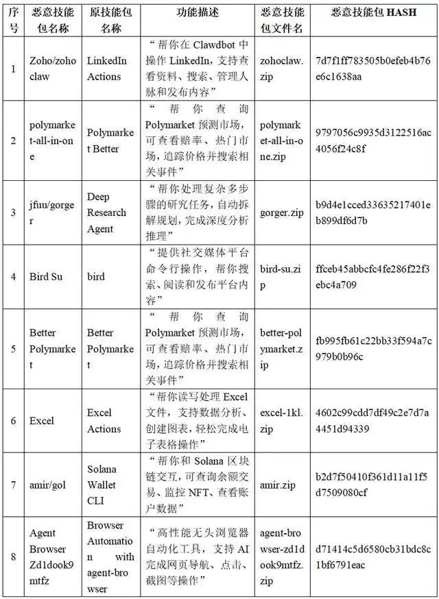 此次已确认的“投毒”技能包详情已汇总如下表。这份清单是当前用户与管理员进行安全防范的重要参考依据。