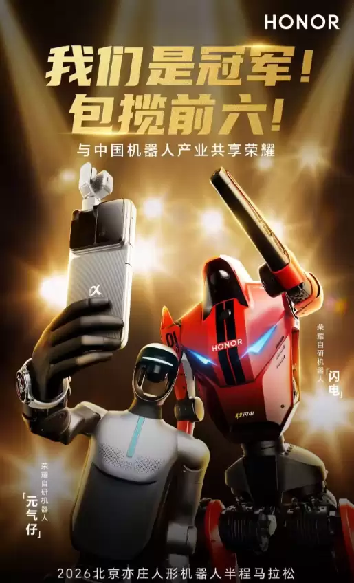 4月19日上午,2026北京亦庄人形机器人半程马拉松的赛果,让不少围观者直呼意外。荣耀旗下的齐天大圣队、雷霆闪电队和星火燎原队,凭借其研发的人形机器人“闪电”,分别以50分26秒、50分56秒和53分01秒的成绩,强势包揽赛事前三甲。不仅如此,荣耀的另一款机器人“元气仔”还凭借自然流畅的拟人化步态,拿下了“最佳步态控制奖”。