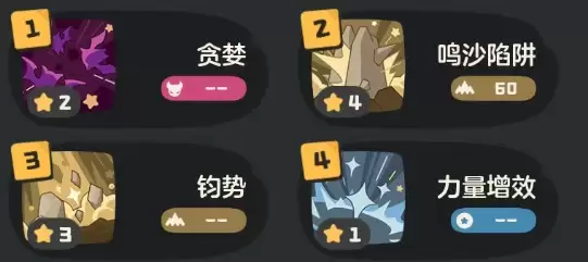 技能携带方面,推荐固定配置以下四招:贪婪、钧势、力量增效、鸣沙陷阱。这套组合完美兼顾了生存恢复、攻击强化与核心输出,是通关的保障,不建议随意更换。