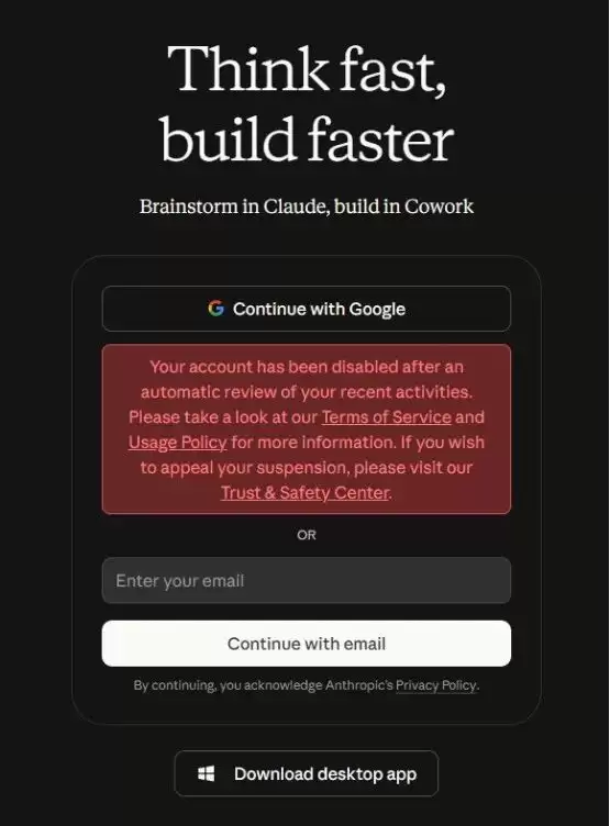其实很早便注册过Claude账号。大约在其发布Claude Code时,曾抱着猎奇心态再次尝试。不料,某个平静的午后,当准备与克老师协同工作时,账号赫然被封禁。愤懑之余尝试申诉,甚至请已被“降智”的搁咪妮老师帮忙起草英文申诉信,结果均石沉大海。