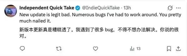 许多用户的反馈非常直接:Bug 数量多到实际上已阻碍了任何有效的开发工作。