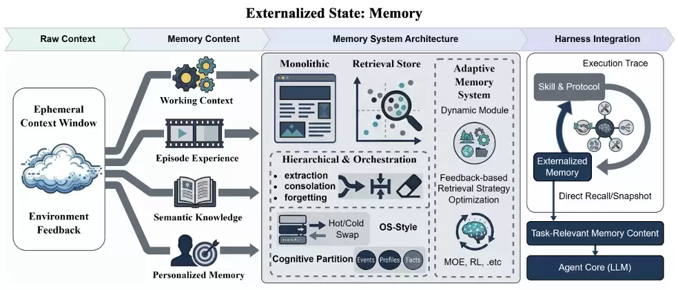 当前工业界的主流模式是“上下文结合检索存储”:只在提示词中保留近期的工作状态,长周期的追踪记录则存储在外部数据库,按需检索。更为先进的分层记忆与编排架构开始引入操作系统的设计理念,区分冷热数据并在不同存储层级间交换,同时引入显式的提取、巩固和遗忘机制。最前沿的自适应记忆系统则不再依赖固定规则,而是根据经验动态调整路由决策,例如通过强化学习持续优化检索策略。