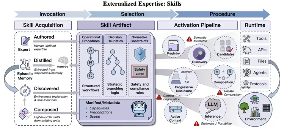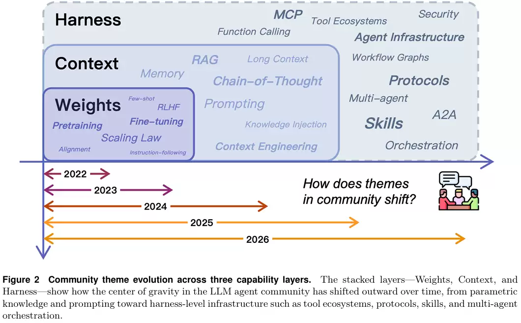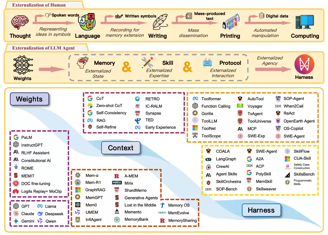 正如论文总览图所揭示的,人类认知外化史与LLM智能体的能力外移路径呈现出惊人的平行映射。模型的能力正从隐藏的权重参数、有限的上下文窗口,一路向外迁移到记忆、技能、协议与Harness这些外部基础设施之中。