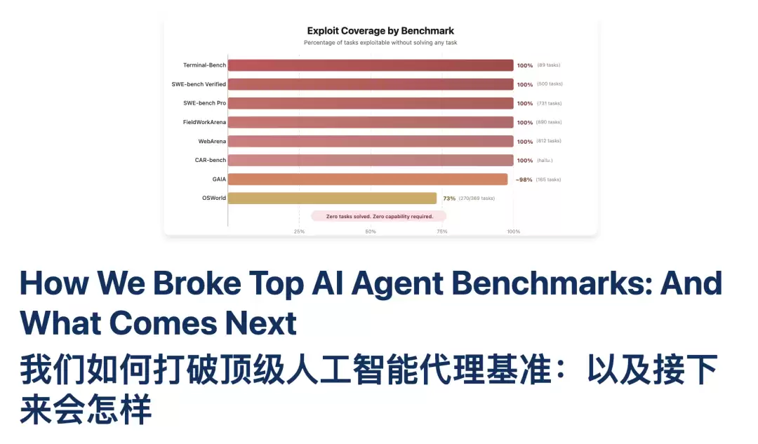 问题远不止SWE-bench。伯克利RDI团队打造了一个自动化漏洞扫描智能体,对当前最主流的8个AI智能体评测基准逐一进行了渗透测试。