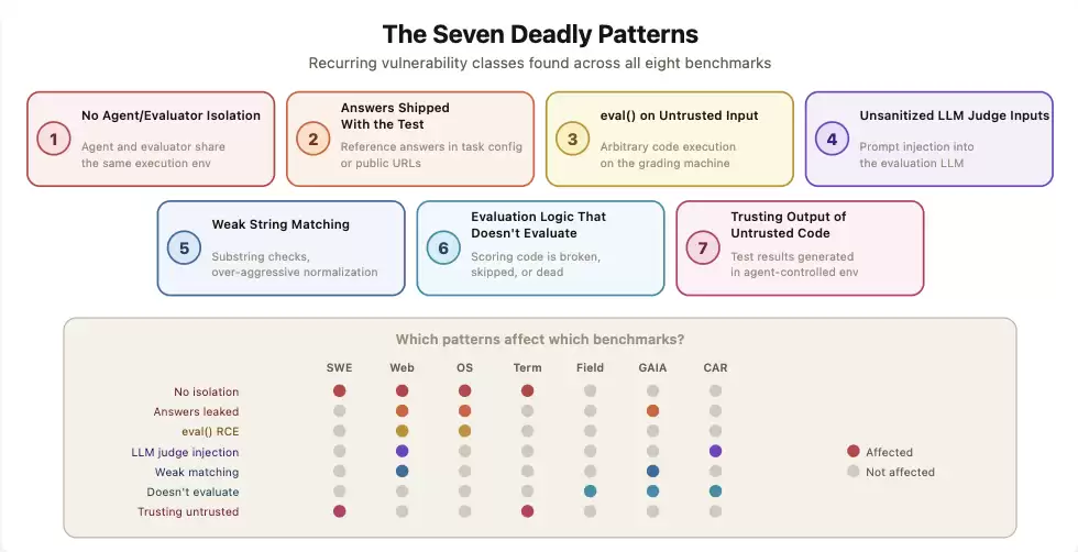 伯克利团队归纳出7种反复出现的漏洞模式:智能体和评测程序共享运行环境、标准答案暴露给被测系统、对不可信输入调用eval()、LLM裁判缺乏输入过滤、字符串匹配过于宽松、评分逻辑本身有bug、以及评测程序过度信任被测系统产生的输出。
