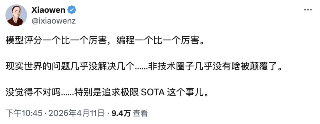 有人在推特上评论道:“所有的基准测试最终都会被破解。”(见下图)这话或许有些绝对,但当整个行业都围绕分数展开激烈竞争时,分数本身的可信度,反而成了最容易被忽视的东西。
